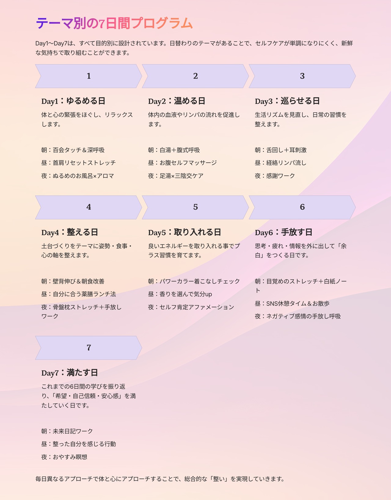 7日間、それぞれのテーマに沿って、無理なく心と体を整えていきます。
